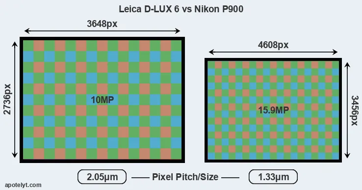 Despite having a smaller sensor, the P900 offers a higher resolution of 15.9 megapixels, compared with 10 MP of the D-LUX 6. This megapixels advantage comes at the cost of a higher pixel density and a smaller size of the individual pixel (with a pixel pitch of 1.33μm versus 2.05μm for the D-LUX 6). However, it should be noted that the P900 is much more recent (by 2 years and 5 months) than the D-LUX 6, and its sensor will have benefitted from technological advances during this time that make it possible to gather light more efficiently. Coming back to sensor resolution, it should be mentioned that the P900 has no anti-alias filter installed, so that it can capture all the detail its sensor resolves.