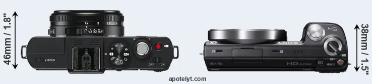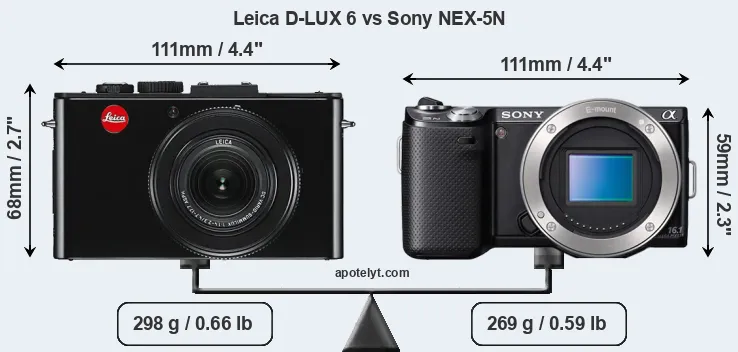 If the front view area (width x height) of the cameras is taken as an aggregate measure of their size, the Sony NEX-5N is notably smaller (13 percent) than the Leica D-LUX 6. In this context, it is worth noting that neither the D-LUX 6 nor the NEX-5N are weather-sealed.
