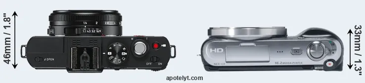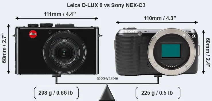 An illustration of the physical size and weight of the Leica D-LUX 6 and the Sony NEX-C3 is provided in the side-by-side display below. The two cameras are presented according to their relative size. Three successive views from the front, the top, and the rear are shown. All width, height and depth dimensions are rounded to the nearest millimeter.