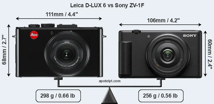If the front view area (width x height) of the cameras is taken as an aggregate measure of their size, the Sony ZV-1F is notably smaller (16 percent) than the Leica D-LUX 6. Moreover, the ZV-1F is markedly lighter (14 percent) than the D-LUX 6. In this context, it is worth noting that neither the D-LUX 6 nor the ZV-1F are weather-sealed.