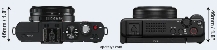 The side-by-side display below illustrates the physical size and weight of the Leica D-LUX 6 and the Sony ZV-1F. The two cameras are presented according to their relative size. Three consecutive views from the front, the top, and the rear side are shown. All width, height and depth dimensions are rounded to the nearest millimeter.