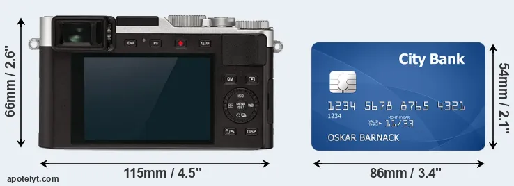 An illustration of the physical dimensions of the Leica D-LUX 7 vis-à-vis a credit card is provided in the side-by-side display below. Three consecutive views from the front, the top, and the rear side are shown. All size dimensions are rounded to the nearest millimeter.