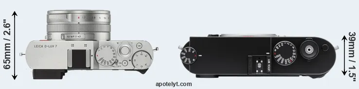 If the front view area (width x height) of the cameras is taken as an aggregate measure of their size, the Leica M11 is considerably larger (47 percent) than the Leica D-LUX 7. It is noteworthy in this context that the M11 is splash and dust-proof, while the D-LUX 7 does not feature any corresponding weather-sealing.