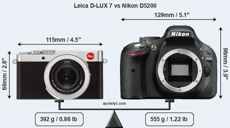 The physical size and weight of the Leica D-LUX 7 and the Nikon D5200 are illustrated in the side-by-side display below. The two cameras are presented according to their relative size. Three consecutive perspectives from the front, the top, and the back are available. All width, height and depth dimensions are rounded to the nearest millimeter.