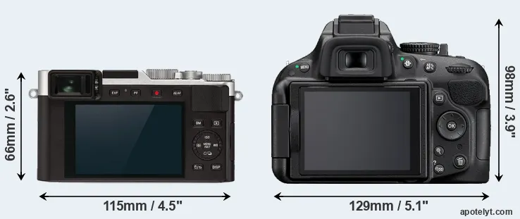 The above size and weight comparisons are to some extent incomplete and possibly misleading, as the D-LUX 7 has a lens built in, whereas the D5200 is an interchangeable lens camera that requires a separate lens. Attaching the latter will add extra weight and bulk to the setup. You can compare the optics available for the D5200 and their specifications in the Nikon Lens Catalog.