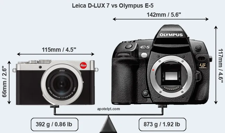 The physical size and weight of the Leica D-LUX 7 and the Olympus E-5 are illustrated in the side-by-side display below. The two cameras are presented according to their relative size. Three consecutive views from the front, the top, and the rear side are shown. All width, height and depth dimensions are rounded to the nearest millimeter.