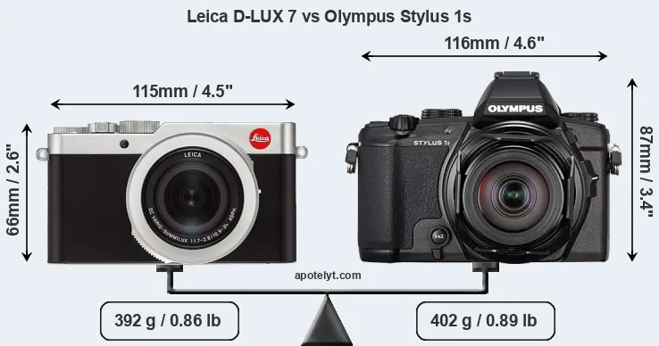 If the front view area (width x height) of the cameras is taken as an aggregate measure of their size, the Olympus Stylus 1s is notably larger (33 percent) than the Leica D-LUX 7. Moreover, the Stylus 1s is slightly heavier (3 percent) than the D-LUX 7. In this context, it is worth noting that neither the D-LUX 7 nor the Stylus 1s are weather-sealed.