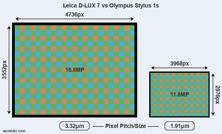 With 16.8MP, the D-LUX 7 offers a higher resolution than the Stylus 1s (11.8MP), but the D-LUX 7 nevertheless has larger individual pixels (pixel pitch of 3.32μm versus 1.91μm for the Stylus 1s) due to its larger sensor. Moreover, the D-LUX 7 is a much more recent model (by 3 years and 7 months) than the Stylus 1s, and its sensor will have benefitted from technological advances during this time that further enhance the light gathering capacity of its pixels. Coming back to sensor resolution, it should be mentioned that neither of the two cameras has an anti-alias filter installed, so they are able to capture all the detail the sensor resolves.
