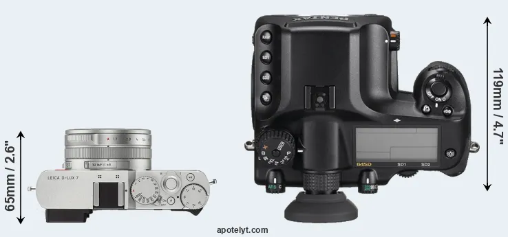 The side-by-side display below illustrates the physical size and weight of the Leica D-LUX 7 and the Pentax 645D. The two cameras are presented according to their relative size. Three consecutive perspectives from the front, the top, and the back are available. All width, height and depth measures are rounded to the nearest millimeter.