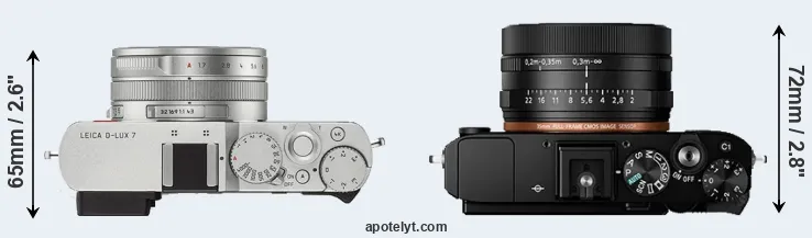 The physical size and weight of the Leica D-LUX 7 and the Sony RX1R II are illustrated in the side-by-side display below. The two cameras are presented according to their relative size. Three successive views from the front, the top, and the rear are shown. All width, height and depth measures are rounded to the nearest millimeter.