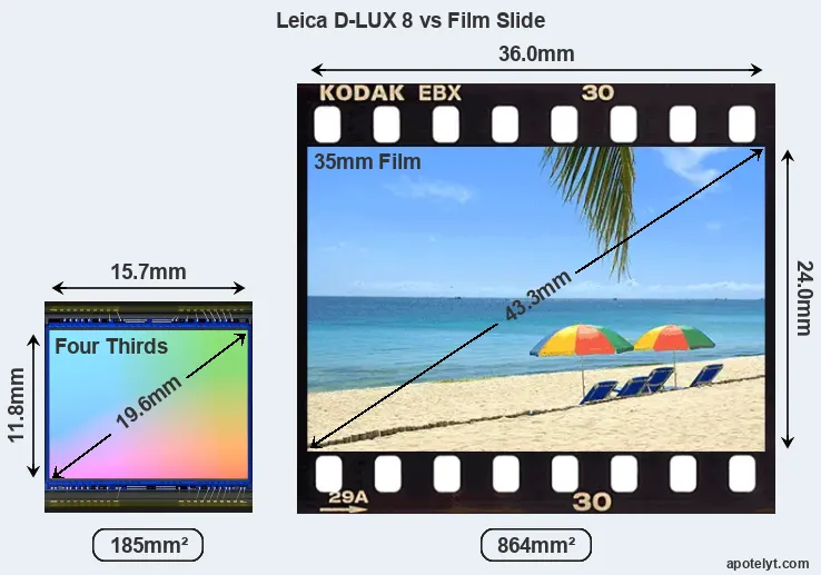 The Leica D-LUX 8 features a Four Thirds sensor and has a format factor (sometimes also referred to as "crop factor") of 2.2. Within the spectrum of camera sensors, this places the Leica D-LUX 8 among the medium-sized sensor cameras that aim to strike a balance between image quality and portability.