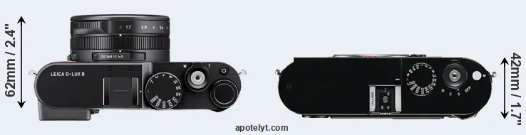 If the front view area (width x height) of the cameras is taken as an aggregate measure of their size, the Leica M Typ 240 is notably larger (24 percent) than the Leica D-LUX 8. It is noteworthy in this context that the M Typ 240 is splash and dust-proof, while the D-LUX 8 does not feature any corresponding weather-sealing.