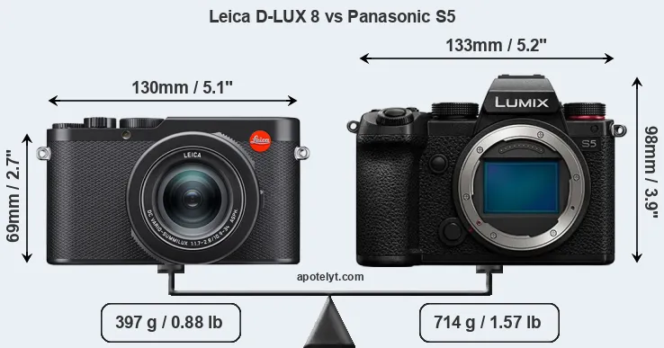 The above size and weight comparisons are to some extent incomplete and possibly misleading, as the D-LUX 8 has a lens built in, whereas the S5 is an interchangeable lens camera that requires a separate lens. Attaching the latter will add extra weight and bulk to the setup.