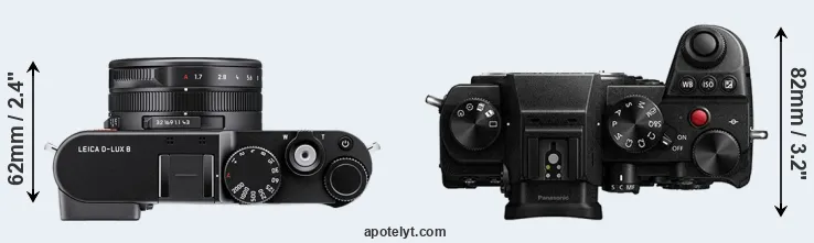 If the front view area (width x height) of the cameras is taken as an aggregate measure of their size, the Panasonic S5 is considerably larger (45 percent) than the Leica D-LUX 8. It is noteworthy in this context that the S5 is splash and dust-proof, while the D-LUX 8 does not feature any corresponding weather-sealing.