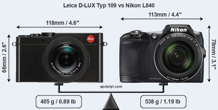 An illustration of the physical size and weight of the Leica D-LUX Typ 109 and the Nikon L840 is provided in the side-by-side display below. The two cameras are presented according to their relative size. Three successive views from the front, the top, and the rear are shown. All width, height and depth measures are rounded to the nearest millimeter.