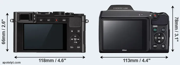 If the front view area (width x height) of the cameras is taken as an aggregate measure of their size, the Nikon L840 is notably larger (13 percent) than the Leica D-LUX Typ 109. Moreover, the L840 is markedly heavier (33 percent) than the D-LUX Typ 109. In this context, it is worth noting that neither the D-LUX Typ 109 nor the L840 are weather-sealed.
