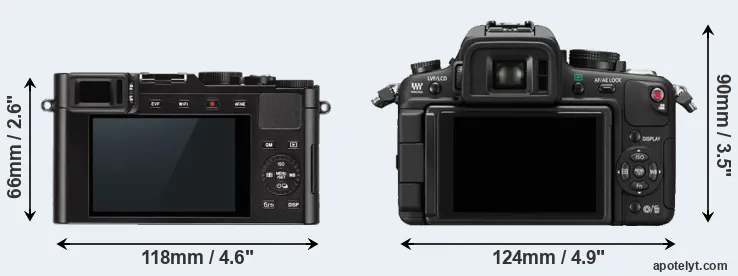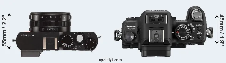 The side-by-side display below illustrates the physical size and weight of the Leica D-LUX Typ 109 and the Panasonic GH1. The two cameras are presented according to their relative size. Three consecutive perspectives from the front, the top, and the back are available. All size dimensions are rounded to the nearest millimeter.