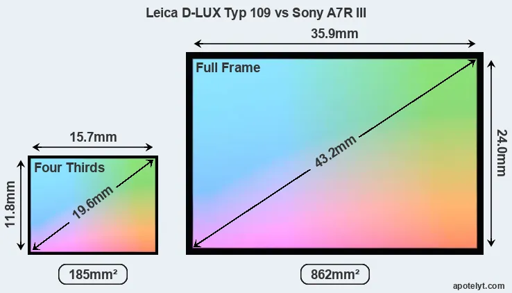 Of the two cameras under consideration, the Leica D-LUX Typ 109 features a Four Thirds sensor and the Sony A7R III a full frame sensor. The sensor area in the A7R III is 366 percent bigger. As a result of these sensor size differences, the cameras have a format factor of, respectively, 2.0 and 1.0. The sensor in the D-LUX Typ 109 has a native 4:3 aspect ratio, while the one in the A7R III offers a 3:2 aspect. The D-LUX Typ 109 has the particularity of featuring a switch that allows to toggle between multiple aspect ratios, while maintaining the same field of view and full image resolution.