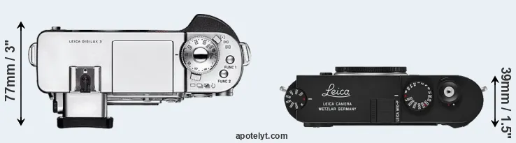If the front view area (width x height) of the cameras is taken as an aggregate measure of their size, the Leica M10-P is notably smaller (12 percent) than the Leica Digilux 3. However, the M10-P is markedly heavier (9 percent) than the Digilux 3. It is noteworthy in this context that the M10-P is splash and dust-proof, while the Digilux 3 does not feature any corresponding weather-sealing.