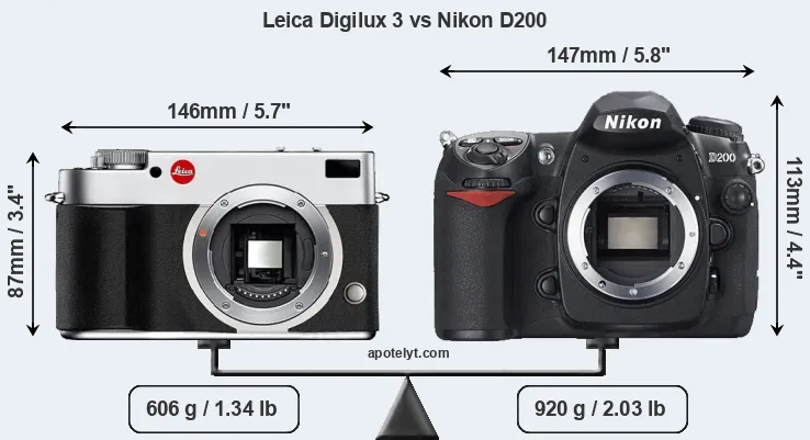 If the front view area (width x height) of the cameras is taken as an aggregate measure of their size, the Nikon D200 is notably larger (31 percent) than the Leica Digilux 3. Moreover, the D200 is substantially heavier (52 percent) than the Digilux 3. It is noteworthy in this context that the D200 is splash and dust-proof, while the Digilux 3 does not feature any corresponding weather-sealing.