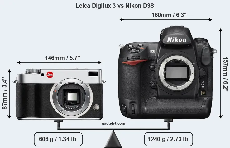 If the front view area (width x height) of the cameras is taken as an aggregate measure of their size, the Nikon D3S is considerably larger (98 percent) than the Leica Digilux 3. Moreover, the D3S is substantially heavier (105 percent) than the Digilux 3. It is noteworthy in this context that the D3S is splash and dust-proof, while the Digilux 3 does not feature any corresponding weather-sealing.