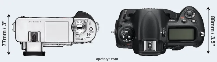 The side-by-side display below illustrates the physical size and weight of the Leica Digilux 3 and the Nikon D3S. The two cameras are presented according to their relative size. Three consecutive views from the front, the top, and the rear side are shown. All width, height and depth measures are rounded to the nearest millimeter.