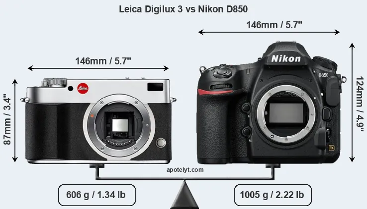 The physical size and weight of the Leica Digilux 3 and the Nikon D850 are illustrated in the side-by-side display below. The two cameras are presented according to their relative size. Three successive views from the front, the top, and the rear are shown. All width, height and depth measures are rounded to the nearest millimeter.