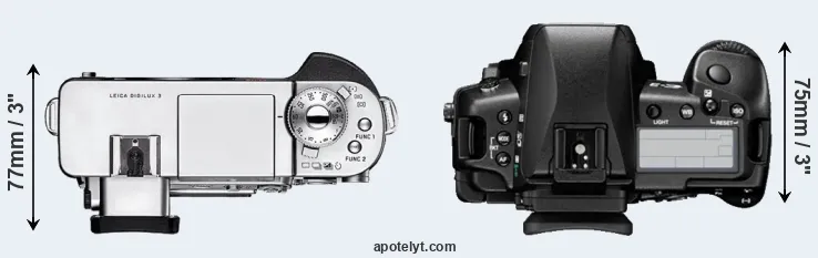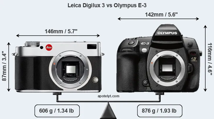If the front view area (width x height) of the cameras is taken as an aggregate measure of their size, the Olympus E-3 is notably larger (30 percent) than the Leica Digilux 3. Moreover, the E-3 is substantially heavier (45 percent) than the Digilux 3. It is noteworthy in this context that the E-3 is splash and dust-proof, while the Digilux 3 does not feature any corresponding weather-sealing.