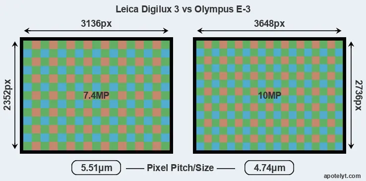 While the two cameras under review share the same sensor size, the E-3 offers a higher resolution of 10 megapixels, compared with 7.4 MP of the Digilux 3. This megapixels advantage translates into a 16 percent gain in linear resolution. On the other hand, these sensor specs imply that the E-3 has a higher pixel density and a smaller size of the individual pixel (with a pixel pitch of 4.74μm versus 5.51μm for the Digilux 3). However, it should be noted that the E-3 is a somewhat more recent model (by 1 year and 1 month) than the Digilux 3, and its sensor might have benefitted from technological advances during this time that at least partly compensate for the smaller pixel size.