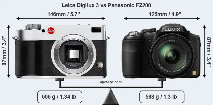 An illustration of the physical size and weight of the Leica Digilux 3 and the Panasonic FZ200 is provided in the side-by-side display below. The two cameras are presented according to their relative size. Three successive views from the front, the top, and the rear are shown. All width, height and depth measures are rounded to the nearest millimeter.