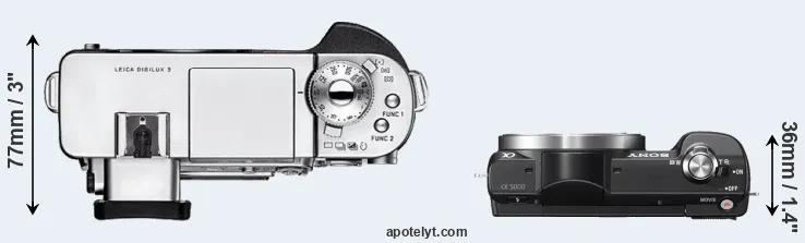 The side-by-side display below illustrates the physical size and weight of the Leica Digilux 3 and the Sony A5000. The two cameras are presented according to their relative size. Three consecutive views from the front, the top, and the rear side are shown. All width, height and depth dimensions are rounded to the nearest millimeter.