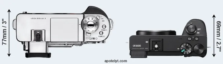 The side-by-side display below illustrates the physical size and weight of the Leica Digilux 3 and the Sony A6600. The two cameras are presented according to their relative size. Three consecutive views from the front, the top, and the rear side are shown. All size dimensions are rounded to the nearest millimeter.