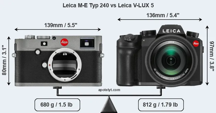 If the front view area (width x height) of the cameras is taken as an aggregate measure of their size, the Leica V-LUX 5 is notably larger (19 percent) than the Leica M-E Typ 240. It is worth mentioning in this context that the M-E Typ 240 is splash and dust resistant, while the V-LUX 5 does not feature any corresponding weather-sealing.