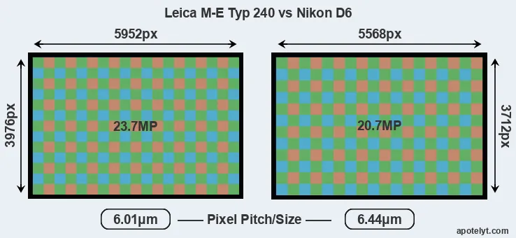 Despite having a slightly smaller sensor, the Leica M-E Typ 240 offers a higher resolution of 23.7 megapixels, compared with 20.7 MP of the Nikon D6. This megapixels advantage comes at the cost of a higher pixel density and a smaller size of the individual pixel (with a pixel pitch of 6.01μm versus 6.44μm for the D6). Moreover, it should be noted that the D6 is a somewhat more recent model (by 7 months) than the M-E Typ 240, and its sensor might have benefitted from technological advances during this time that further enhance the light gathering capacity of its pixel-units.