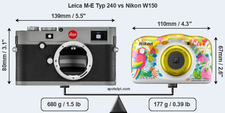 The physical size and weight of the Leica M-E Typ 240 and the Nikon W150 are illustrated in the side-by-side display below. The two cameras are presented according to their relative size. Three successive views from the front, the top, and the rear are shown. All width, height and depth dimensions are rounded to the nearest millimeter.