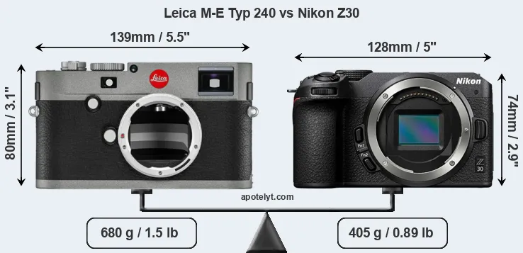 An illustration of the physical size and weight of the Leica M-E Typ 240 and the Nikon Z30 is provided in the side-by-side display below. The two cameras are presented according to their relative size. Three consecutive views from the front, the top, and the rear side are shown. All width, height and depth measures are rounded to the nearest millimeter.
