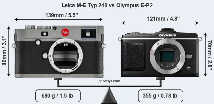 If the front view area (width x height) of the cameras is taken as an aggregate measure of their size, the Olympus E-P2 is notably smaller (24 percent) than the Leica M-E Typ 240. Moreover, the E-P2 is substantially lighter (48 percent) than the M-E Typ 240. It is worth mentioning in this context that the M-E Typ 240 is splash and dust resistant, while the E-P2 does not feature any corresponding weather-sealing.