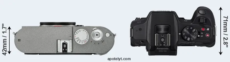 An illustration of the physical size and weight of the Leica M-E Typ 240 and the Panasonic G6 is provided in the side-by-side display below. The two cameras are presented according to their relative size. Three successive views from the front, the top, and the rear are shown. All width, height and depth dimensions are rounded to the nearest millimeter.