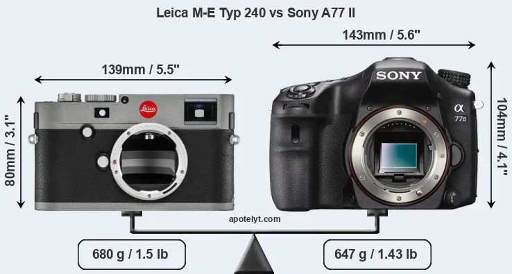 An illustration of the physical size and weight of the Leica M-E Typ 240 and the Sony A77 II is provided in the side-by-side display below. The two cameras are presented according to their relative size. Three successive views from the front, the top, and the rear are shown. All width, height and depth dimensions are rounded to the nearest millimeter.