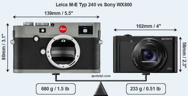 An illustration of the physical size and weight of the Leica M-E Typ 240 and the Sony WX800 is provided in the side-by-side display below. The two cameras are presented according to their relative size. Three successive views from the front, the top, and the rear are shown. All width, height and depth dimensions are rounded to the nearest millimeter.