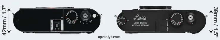 An illustration of the physical size and weight of the Leica M Typ 240 and the Leica M10-P is provided in the side-by-side display below. The two cameras are presented according to their relative size. Three consecutive views from the front, the top, and the rear side are shown. All width, height and depth measures are rounded to the nearest millimeter.