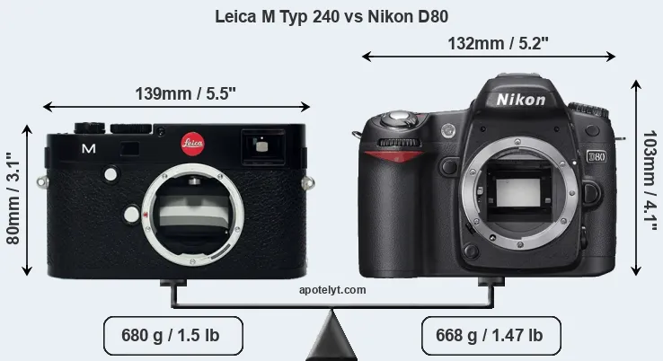 If the front view area (width x height) of the cameras is taken as an aggregate measure of their size, the Nikon D80 is notably larger (22 percent) than the Leica M Typ 240. However, the D80 is slightly lighter (2 percent) than the M Typ 240. It is worth mentioning in this context that the M Typ 240 is splash and dust resistant, while the D80 does not feature any corresponding weather-sealing.