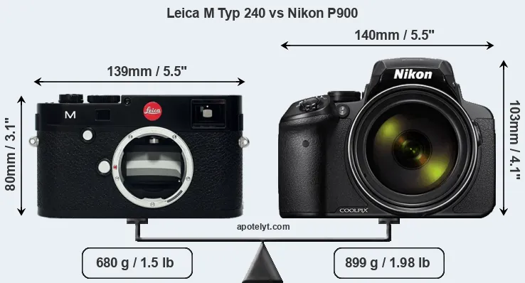 If the front view area (width x height) of the cameras is taken as an aggregate measure of their size, the Nikon P900 is notably larger (30 percent) than the Leica M Typ 240. It is worth mentioning in this context that the M Typ 240 is splash and dust resistant, while the P900 does not feature any corresponding weather-sealing.