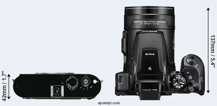 The side-by-side display below illustrates the physical size and weight of the Leica M Typ 240 and the Nikon P900. The two cameras are presented according to their relative size. Three successive views from the front, the top, and the rear are shown. All width, height and depth dimensions are rounded to the nearest millimeter.