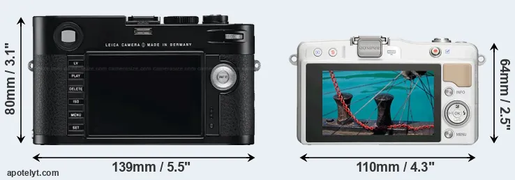 If the front view area (width x height) of the cameras is taken as an aggregate measure of their size, the Olympus E-PM2 is considerably smaller (37 percent) than the Leica M Typ 240. Moreover, the E-PM2 is substantially lighter (60 percent) than the M Typ 240. It is worth mentioning in this context that the M Typ 240 is splash and dust resistant, while the E-PM2 does not feature any corresponding weather-sealing.