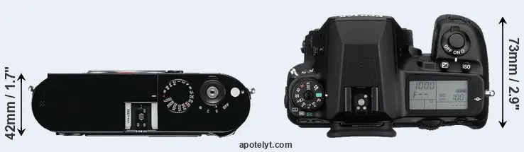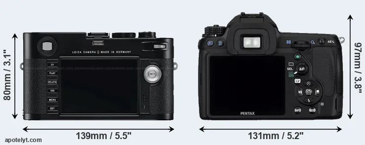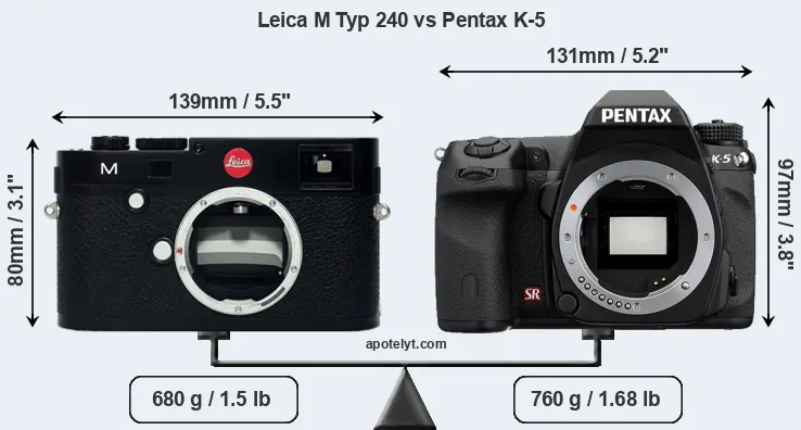 The physical size and weight of the Leica M Typ 240 and the Pentax K-5 are illustrated in the side-by-side display below. The two cameras are presented according to their relative size. Three consecutive perspectives from the front, the top, and the back are available. All width, height and depth measures are rounded to the nearest millimeter.