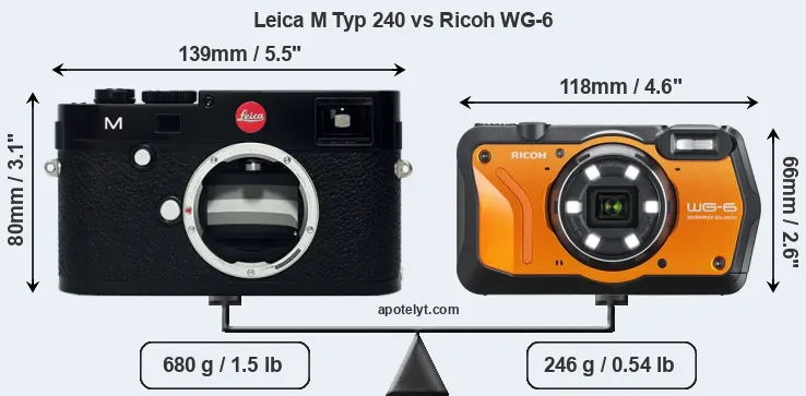 An illustration of the physical size and weight of the Leica M Typ 240 and the Ricoh WG-6 is provided in the side-by-side display below. The two cameras are presented according to their relative size. Three successive views from the front, the top, and the rear are shown. All width, height and depth dimensions are rounded to the nearest millimeter.