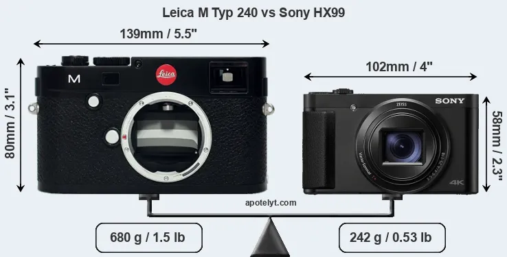 An illustration of the physical size and weight of the Leica M Typ 240 and the Sony HX99 is provided in the side-by-side display below. The two cameras are presented according to their relative size. Three successive views from the front, the top, and the rear are shown. All width, height and depth measures are rounded to the nearest millimeter.
