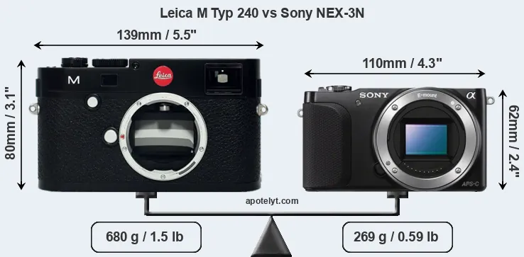 If the front view area (width x height) of the cameras is taken as an aggregate measure of their size, the Sony NEX-3N is considerably smaller (39 percent) than the Leica M Typ 240. Moreover, the NEX-3N is substantially lighter (60 percent) than the M Typ 240. It is worth mentioning in this context that the M Typ 240 is splash and dust resistant, while the NEX-3N does not feature any corresponding weather-sealing.