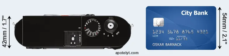 The physical dimensions of the Leica M Typ 262 relative to a credit card are illustrated in the side-by-side display below. Three successive views from the front, the top, and the rear are shown. All width, height and depth measures are rounded to the nearest millimeter.